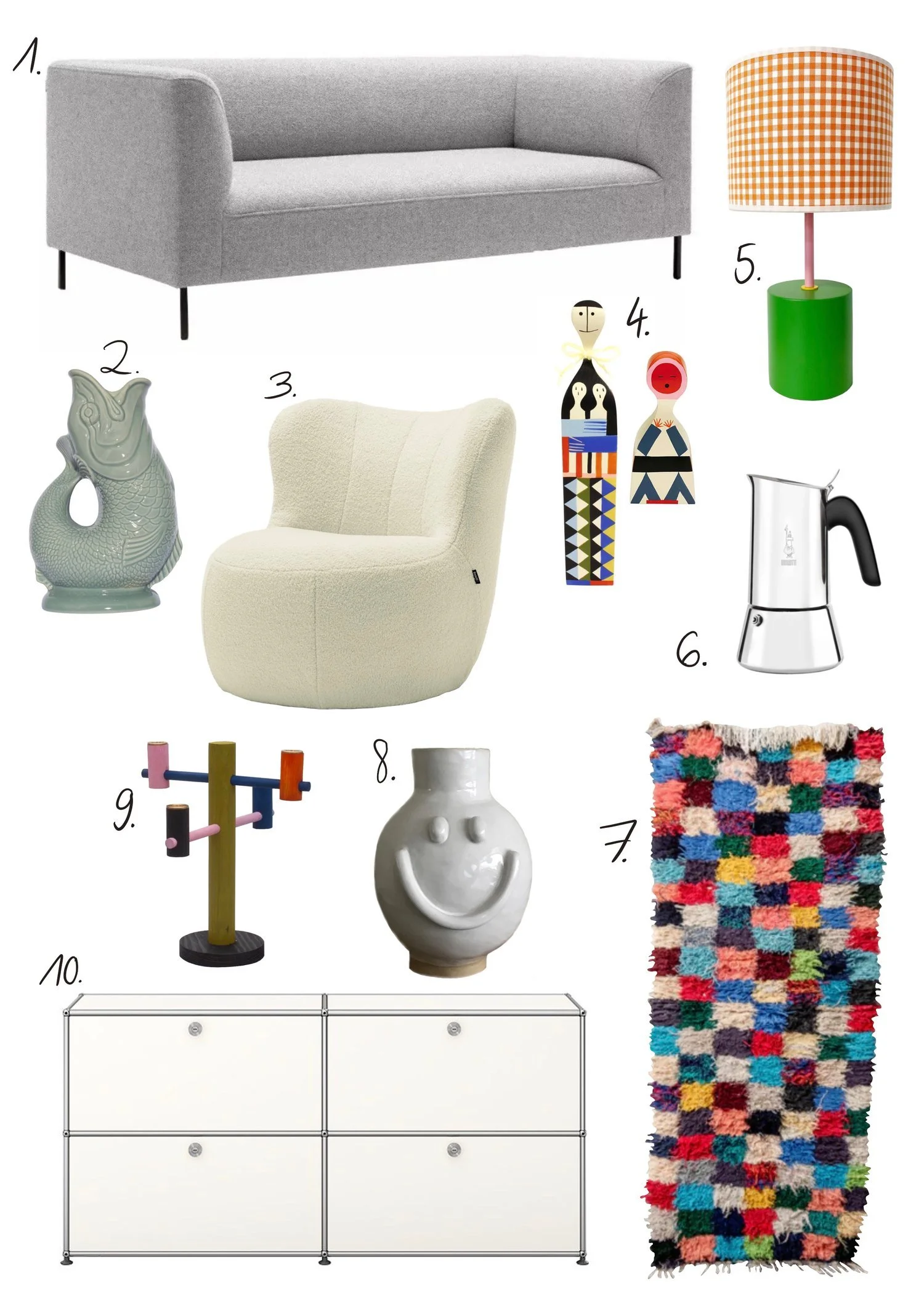 1.Freistil Sofa 2. Gluckigluck Karaffe 3. Freistil Sessel 4. Wooden Dolls 5. Candy Lampe 6. Espressokocher 7. Teppich 8. Vase Smile 9. Kaiteki Kerzenständer 10. USM Haller Sideboard