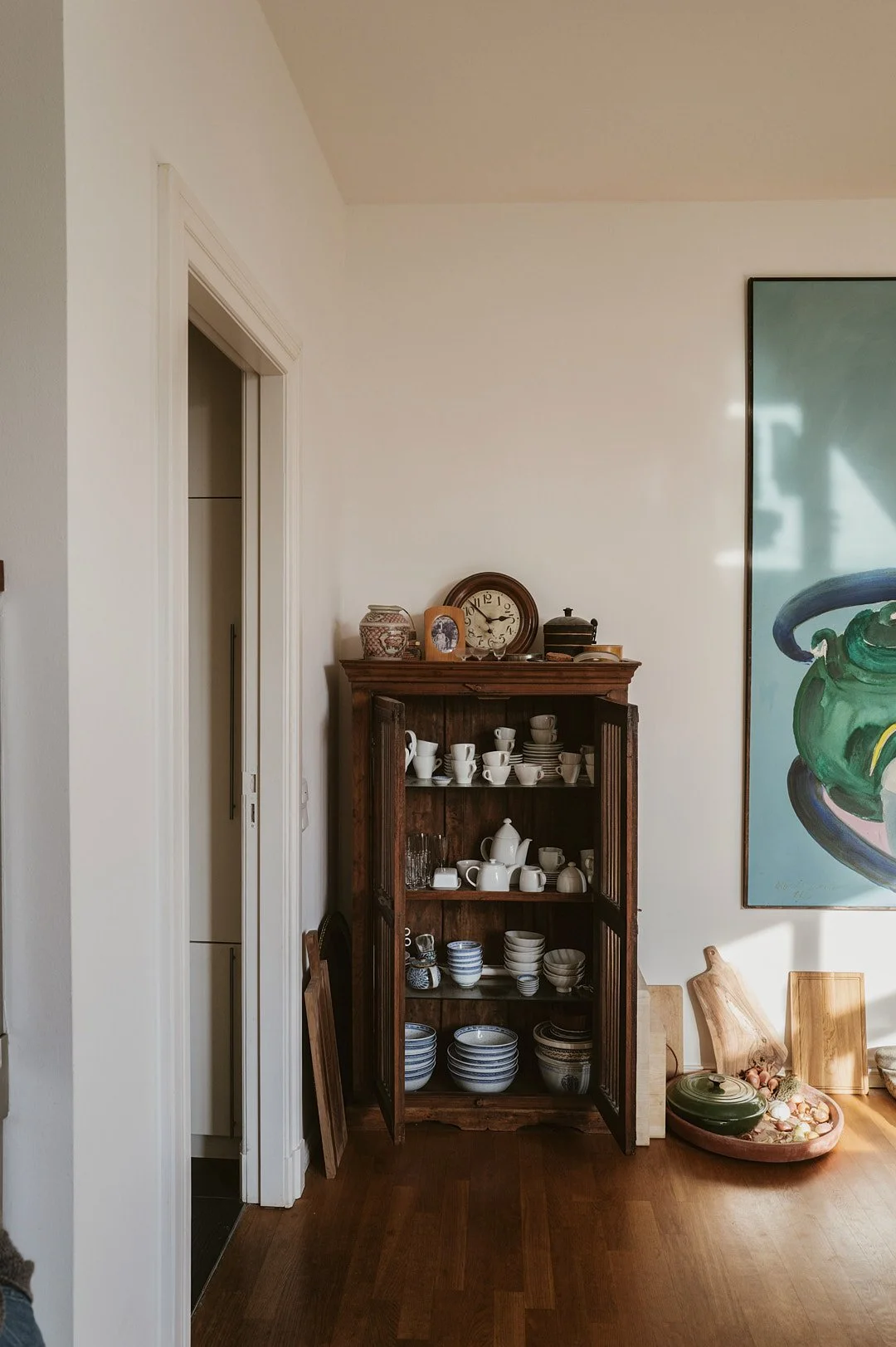 Hanno: Wir haben zwei Altbauwohnungen zusammengelegt und dabei viel Wert auf Offenheit gelegt – aber nicht im Sinne von „Loft mit Designmöbeln“, sondern eher: viel Licht, fließende Übergänge, Räume, die ineinandergreifen. Es gibt keine toten Ecken, keine abgeschlossenen Zonen. Man kann sich frei bewegen – und genau das passiert auch bei unseren Abenden. Die Leute wandern zwischen den Räumen, unterhalten sich mit immer neuen Gesichtern, setzen sich mal hier, mal da. Es entsteht fast automatisch eine Dynamik.